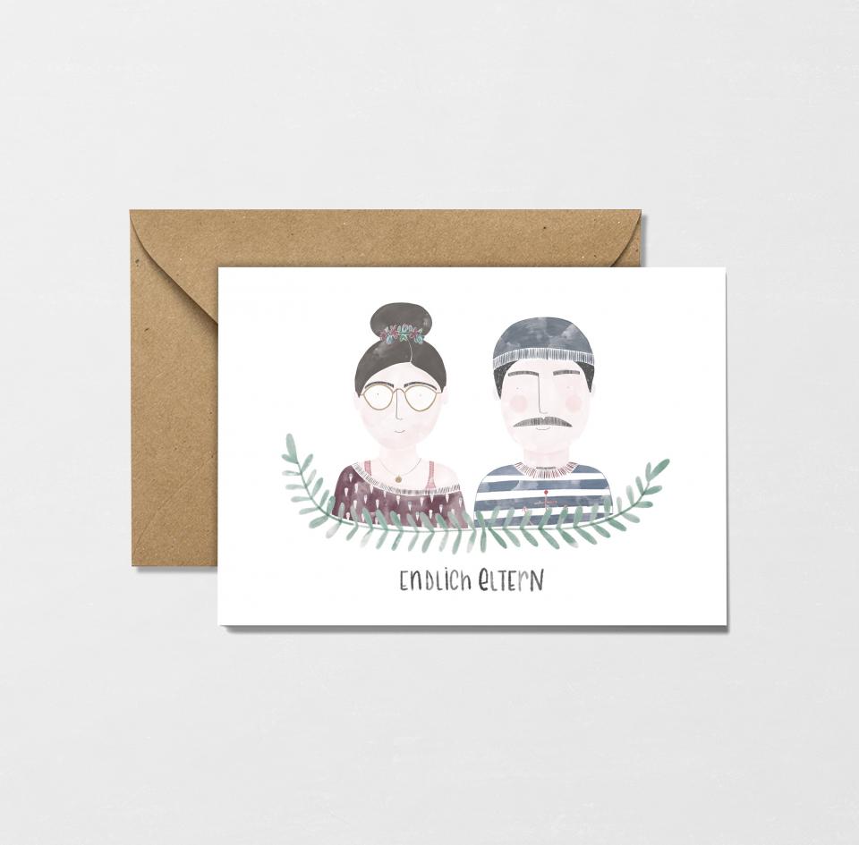 Wunderbar illustrierte Klappkarte im DINA6 Format auf 300g Recyclingpapier. Der Umschlag ist aus braunem Kraftpapier.