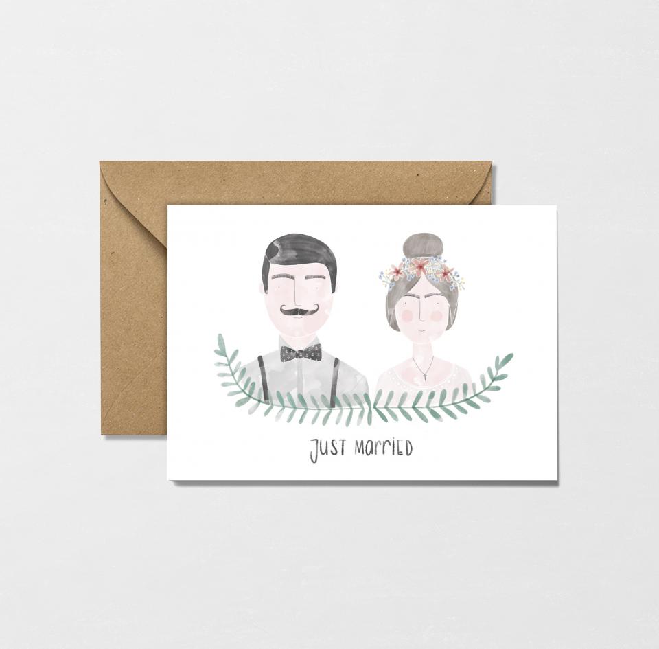Wunderbar illustrierte Klappkarte im DINA6 Format auf 300g Recyclingpapier. Der Umschlag ist aus braunem Kraftpapier.